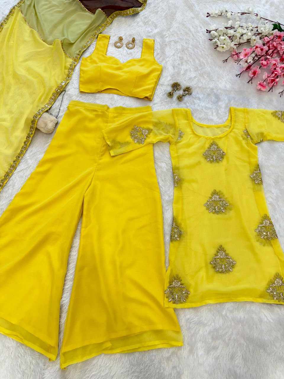 Top – Pure Georgette top featuring elegant embroidery cording and sequence work, fully stitched in a loose-fit silhouette (free size 38–44)