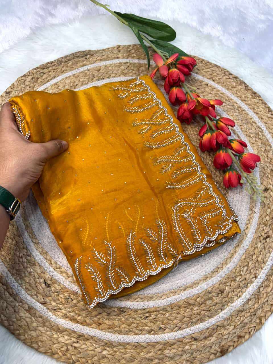 SAREES: Fandy satin silk with val moti jarkhand